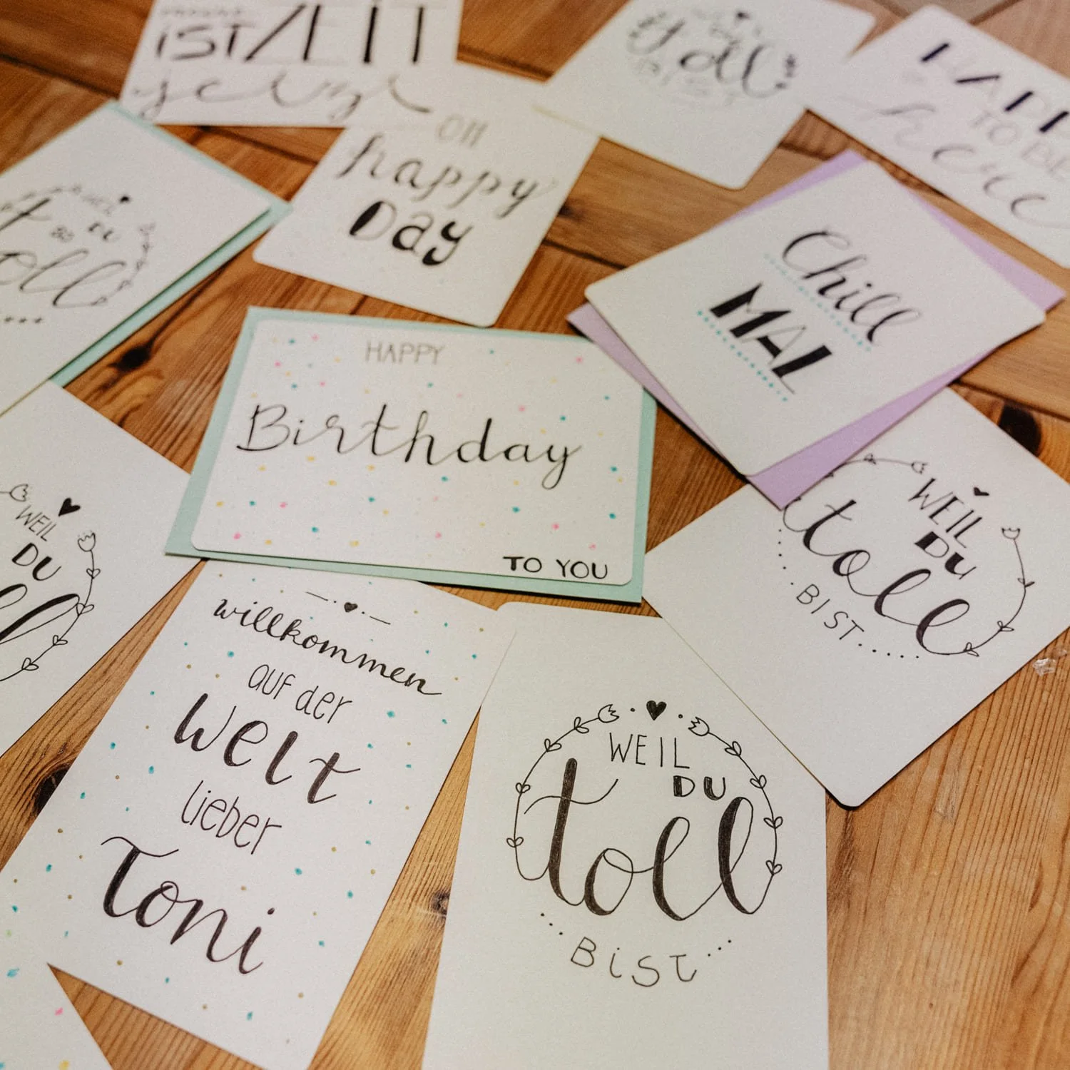 Je nach Workshop-Termin gestalten wir anschließend Klappkarten, Affirmationskarten, Anhänger, Sticker und Buttons.