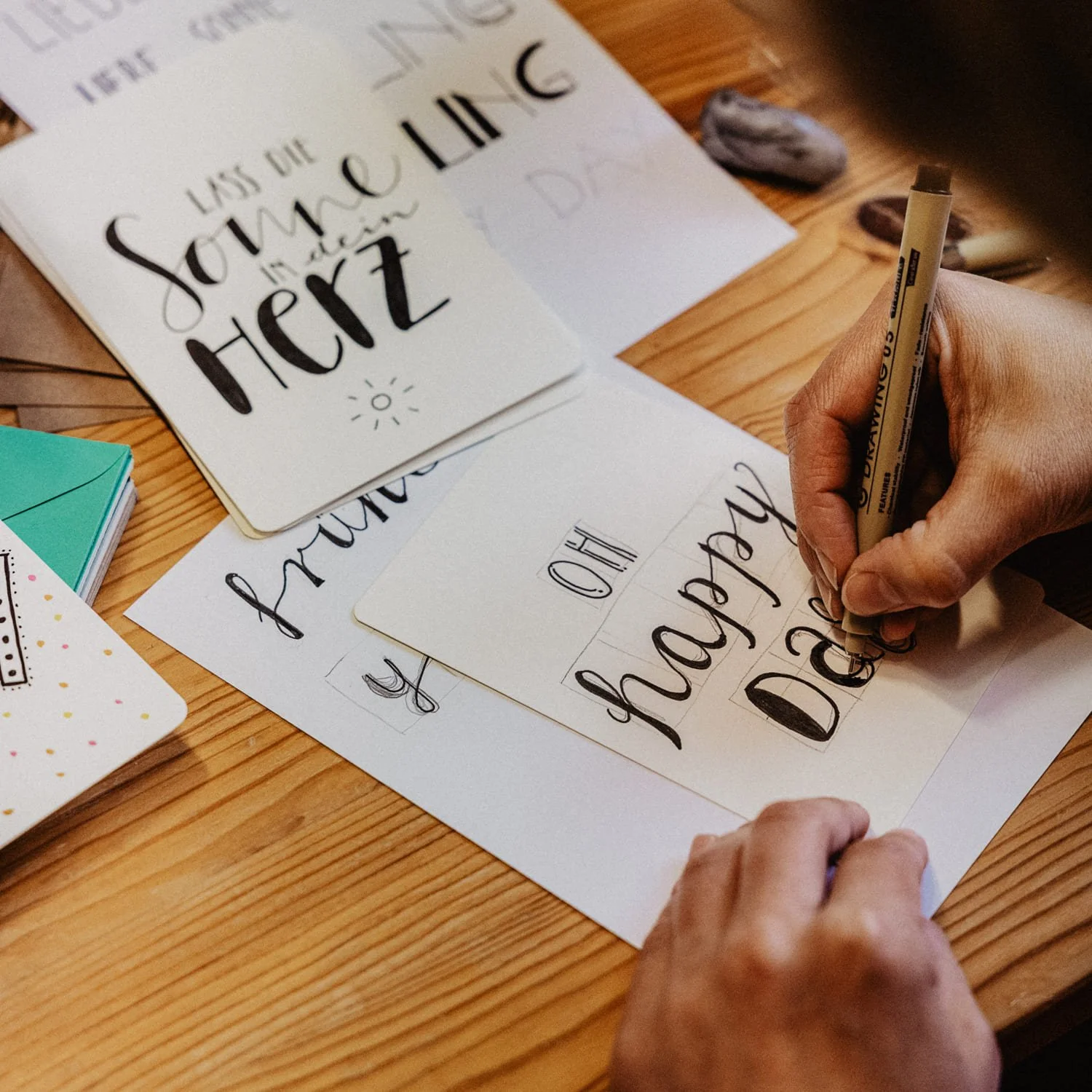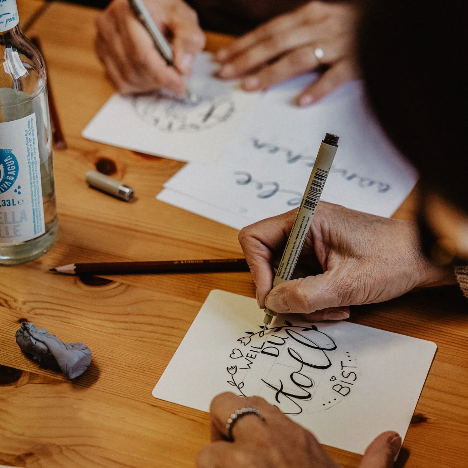 Hierbei machen wir gemeinsam künstlerische Schreibübungen und ich zeige dir Techniken, die es dir ermöglichen deinen eigenen Stil zu entdecken. Du lernst, wie du deine Schrift in Szene setzen kannst und gönnst dir gleichzeitig eine kleine Auszeit vom Alltag.