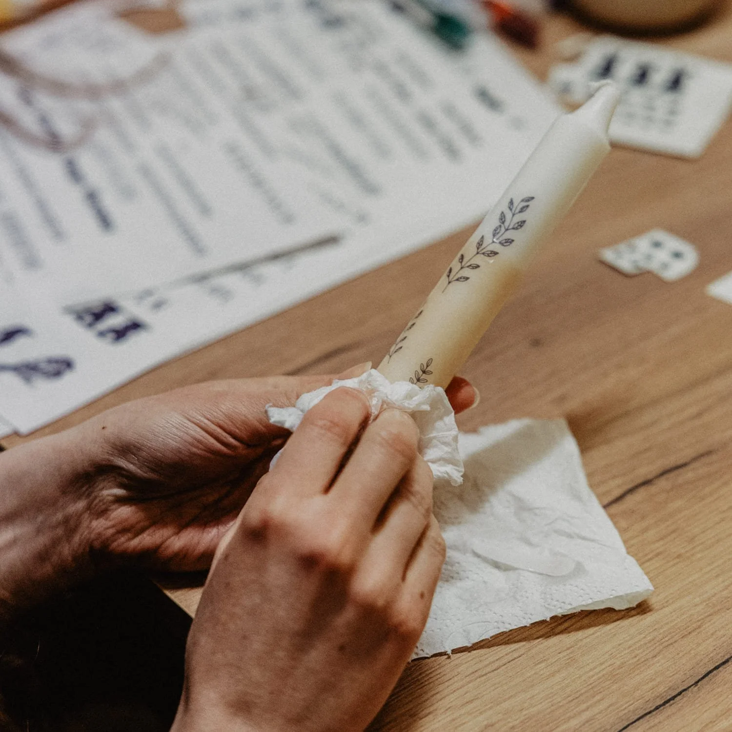 Die Farben, Stempel und Schrift sind bei diesem Workshop saisonal angepasst. Es werden also immer andere Kerzen und es lohnt sich, den Workshop mehrmals zu besuchen.