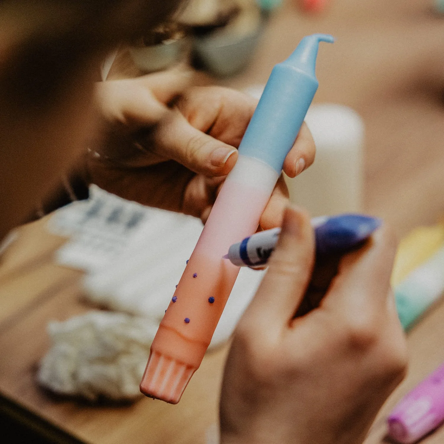 In diesem Workshop färben wir Kerzen, besprenkeln und bemalen sie mit Wachs und verzieren sie mit Symbolen und Worten. So lässt sich jede Kerze ganz individuell gestalten und verschönern. Bring mit deinen individuellen Kerzen Farbe in dein Wohnzimmer, gestalte dir eine Geburtstagskerze, ein Glückslicht oder ein ganz persönliches Geschenk für deine Liebsten. Das Kerzen DIP DYE ist deine eigene und individuelle Kerzengestaltung: ganz schlicht und dezent oder kunterbunt und wild - das entscheidest du.